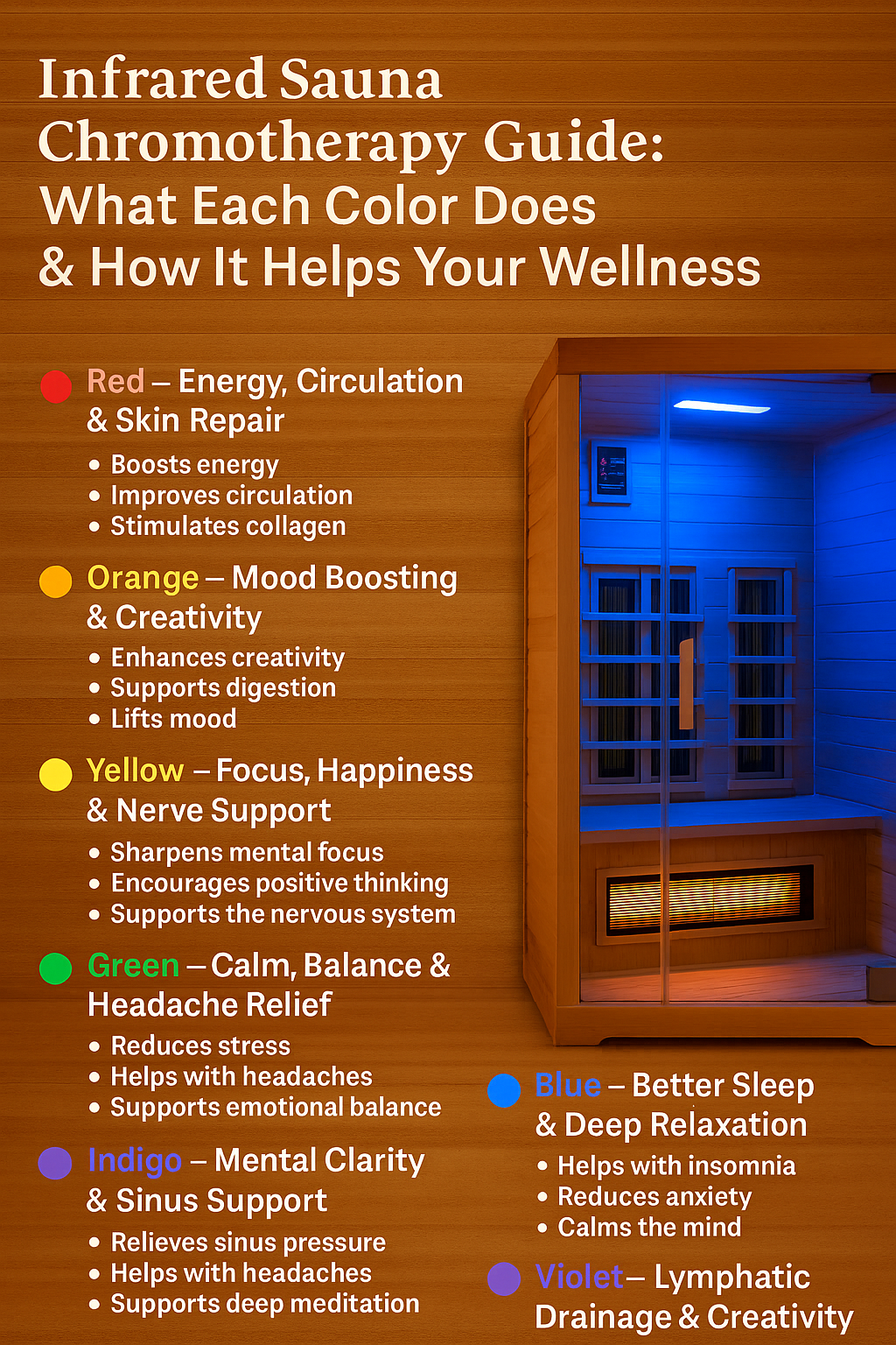 The wavelength of each color interacts with your body in different ways. Shorter wavelengths (like violet, indigo, and blue) tend to have calming, cooling effects on both the body and the mind. They can decrease blood pressure, reduce inflammation, and calm an overactive mind – making them ideal for evening sauna sessions or stress relief.
